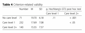 The convergent validity with the criterion “level of care” resulted from the average increase in everyday practical impairments and a significant decrease in the ETAM value, while the level of care required increases (see Table 4 in Book et al., 2018).
