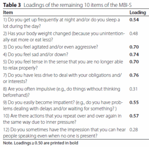 During the validation of the scale, four items were removed due to insufficient psychometric or factor-analytic fit. The final version of the MBI-S thus consists of eight items.